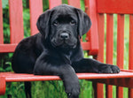 A black Labrador puppy lounging on a red bench on a sunny day.