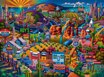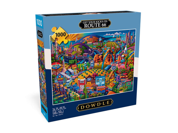 This 1000-piece 26.75 x 19.75 inch interlocking jigsaw puzzle for ages 14+ is titled ""Get Your Kicks on Route 66"" and is based on the artwork of Eric Dowdle. It features a delightful landscape packed with points of interest from America's most famous highway!