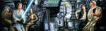 This 750-piece 38.25 x 11.25 inch interlocking panoramic Star Wars(TM) jigsaw puzzle for ages 14+ is titled “Jedi Training Begins”. It features Luke Skywalker wielding his father’s lightsaber against a training remote onboard the Millenium Falcon, under the tutelage of Obi-wan Kenobi, while Han Solo, Chewbacca, C-3PO and R2-D2 look on.