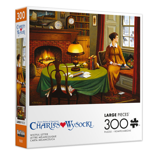 Step into a quiet winter moment with this 300-Piece large format puzzle from Buffalo Games. Charles Wysocki’s 'Wistful Letter' paints a cozy interior scene where a woman gazes out the frosty window, letter in hand, as a fire crackles beside her. A perfect puzzle for lovers of nostalgic storytelling. Finished size is 21.25 x 15 inches. Recommended for ages 14+.