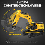 2.4GHz remote control excavator. Engine sounds LED lights Alloy bucket 680 degree turns Lasts 100 minutes.