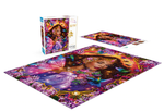 Ce puzzle présente des œuvres illustrant une belle reine entourée de fleurs, de colibris et de bourdons.