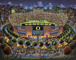 L'Université de l'Oregon, située à Eugene, est bien connue pour leur grande équipe de football et fans de fanatiques. Eric a capturé toute l'excitation des Ducks de l'Oregon en action dans le stade Autzen. Représenté au crépuscule et encadré par le feuillage d'automne, vous pouvez presque sentir la netteté dans les airs dans cette peinture dynamique qui met en valeur le football collégial à son meilleur.
