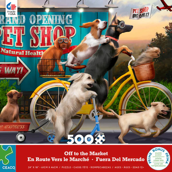 Ce puzzle fantaisiste de 500 pièces, intitulé "Off to the Market", présente six chiens adorables en route vers une grande vente d'animaux de compagnie. Quatre d'entre eux sont empilés sur un seul vélo jaune, tandis que l'on monte à côté d'eux sur un scooter et un autre court. Un couple porte des lunettes. Une affiche bonus est incluse. Comptez sur Ceaco pour les énigmes les plus créatives, les plus excitantes et les plus colorées depuis 1987.