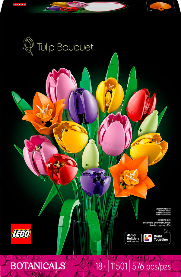 Add a gorgeous piece of flower decor to your home with the LEGO® Botanicals Tulip Bouquet (11501) building kit for adults. Capturing the joy and optimism of spring, this LEGO bouquet features 5 varieties of tulips in various colors and stages of bloom. Immerse yourself in the beauty of flowers as you craft vibrant green buds, purple closed tulips and red, yellow and pink opened tulips, plus green leaves for added authenticity. The flower building set also includes adjustable stems that make it easy to arrange the tulips into a bespoke LEGO bouquet. Once you’ve completed this fun craft project, the set becomes a stunning piece of floral home decor that will bring color to any space. A thoughtful gift for women and men on birthdays, Valentine’s Day, Mother’s Day, housewarmings or any other special occasions, this flower building set is available in the LEGO Builder app, where budding florists can access digital building instructions and track their progress. Set contains 576 pieces.