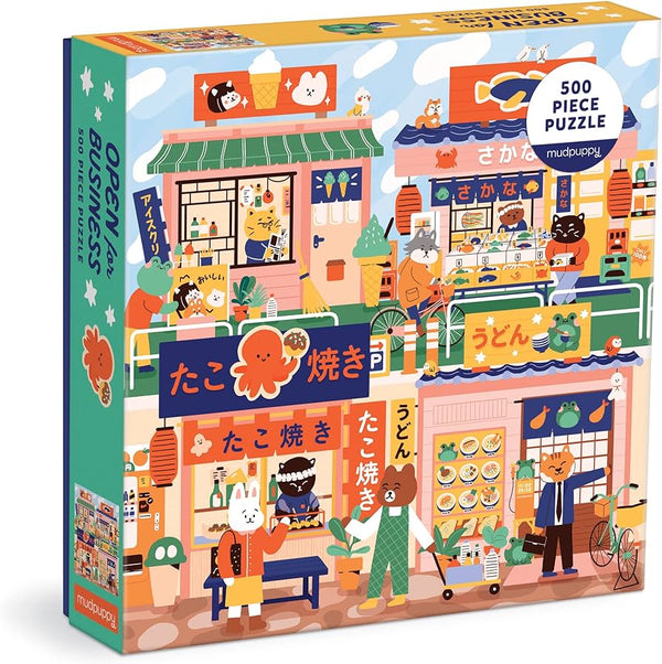 Ouvert pour Business 500 Piece Family Puzzle de Mudpuppy présente des illustrations lumineuses de magasins et restaurants locaux au Japon accueillant chaleureusement les habitants. Les puzzles Mudpuppy sont emballés dans des boîtes robustes à fins mat, parfaites pour les cadeaux, la réutilisation et le stockage.