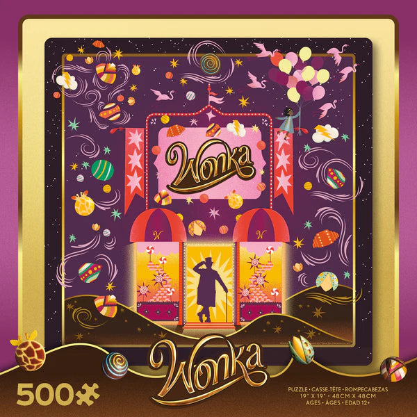 Ce puzzle de 500 pièces célèbre le nouveau film "Wonka". Il présente un collage de bonbons colorés, avec la silhouette de Willy Wonka debout dans une porte en bas et...
