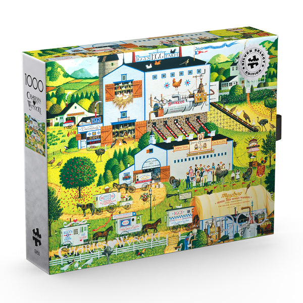 This 26.75 x 19.75 inch interlocking 1000-piece jigsaw puzzle for ages 14+, titled “Sunny Side Up” is based on the artwork of Charles Wysocki. It features an elaborate Egg farming...