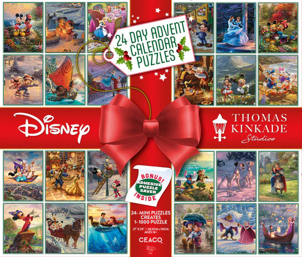 • Déballez la joie de la saison des fêtes avec des amis et de la famille en résolvant ce défi de puzzle consciente de Ceaco! Ce puzzle du calendrier de l'Avent Thomas Kinkade Disney de 24 jours comprend 24 mini puzzles qui créent un puzzle de 1000 pièces mettant en vedette des illustrations de Disney de Thomas Kinkade. Débrochez un nouveau mini-puzzle chaque jour lorsque vous compte à compter les vacances. Cet ensemble comprend également l'épargnant du puzzle adhésif pour préserver votre puzzle pour les années à venir.
