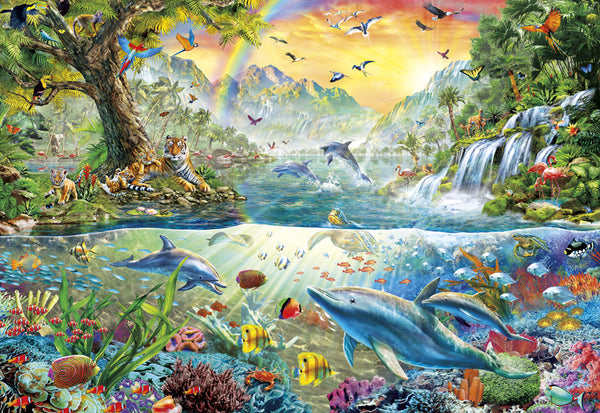Profitez de ce puzzle de 2000 pièces, harmonie tropicale, alors que vous explorez la vie animale sous et au-dessus de l'eau. La vie marine colorée comprend des dauphins sympathiques, des...
