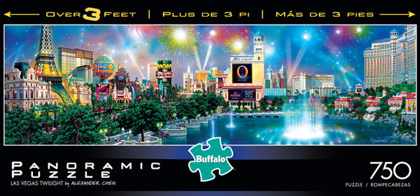 Sin City a l'air spectaculaire dans ce puzzle panoramique de 750 pièces par Alexander Chen! S'étendant plus de 3 pieds de large à la fin, ce puzzle présente des hôtels, des monuments, des feux d'artifice et des fontaines célèbres de Las Vegas. Vous ressentirez l'énergie du crépuscule de Las Vegas en assemblant ce puzzle coloré pièce par pièce.