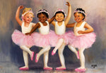 Quatre petites filles douces dansent ensemble dans des tutus roses.