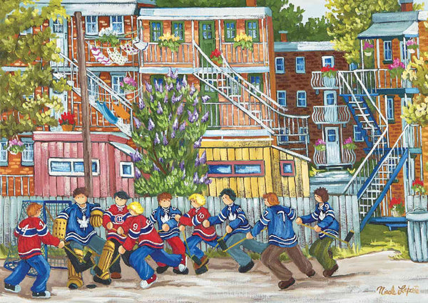 Des garçons jouant au hockey derrière des immeubles d'appartements.