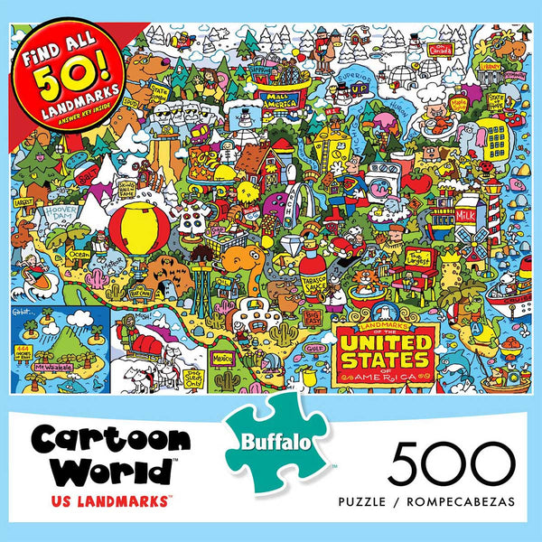 Profitez de rassemblement ce collage de dessins animés de 500 pièces des États-Unis, du sud du Canada et du nord du Mexique. Vous verrez les aliments de base, les bâtiments, les activités qui représentent les pays, les villes, les États et les paysages individuels. Trouvez les 50 points de repère!