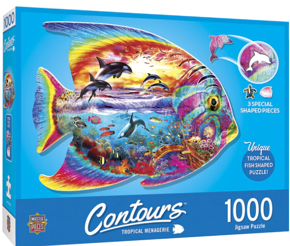 Ce puzzle en forme de poisson tropical de 1000pc. Le puzzle de poisson tropical explose avec un scelfe coloré sur le récif corallien.  Comprend trois pièces de forme spéciale dessinées...