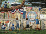 Quel grand souvenir d'enfance - en regardant un jeu de baseball des Cats noirs à travers des trous et des fissures dans la clôture. Deux des enfants les plus chanceux ont l'équivalent de sièges Skybox, perché sur le membre d'un arbre avec un fanion pour montrer leur loyauté envers l'équipe de la ville natale. Leurs animaux de compagnie semblent aussi apprécier l'action!