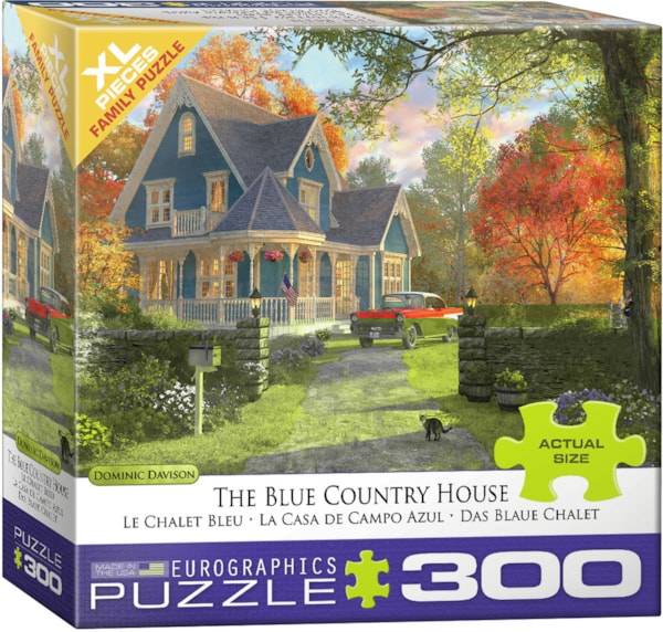 Country Setting Blue Home est une retraite paisible. Pièches de puzzle fortes de haute qualité. Fabriqué à partir de planche recyclée et imprimée avec de l'encre à base de légumes....