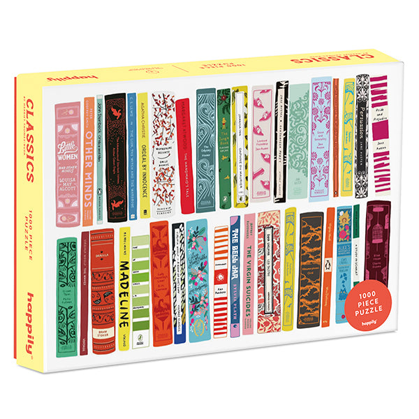 Puzzle de 1 000 pièces avec des illustrations de Book Spines classiques de l'illustrateur acclamé Harriet Thomas-Bush.