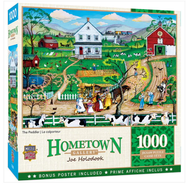 Ce puzzle de la galerie de la ville natale est peint par le talentueux artiste folklorique, Joe Holodook, et ils présentent de belles scènes vintage qui nous rappellent tous les temps les plus simples dans le passé. Le colporteur itinérant vient avec son wagon de marchandises