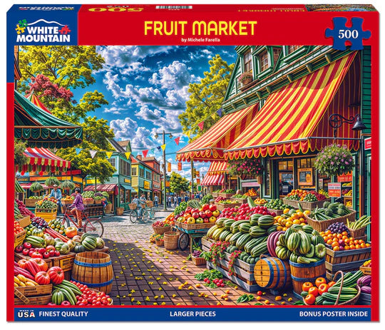 Grab your bag on the way out of the door. The fruit market is open offering the best and freshest fruit and produce around. Melons, apples, and more. Colorful offerings adorn tables, crates, and baskets waiting for you to pick up and select as your own. Artist Michele Farella will have you visiting to the nearest farmers market with this 500 piece jigsaw puzzle.