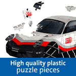 L'emblématique Porsche 911 GT3 Cup est la voiture de course la plus populaire au monde. Vous pouvez maintenant construire votre propre modèle à l'échelle de cette voiture avec ce puzzle en plastique 3D de haute qualité. Une excellente idée cadeau pour tous les fans de Porsche! Une expérience automobile qui fait que le pouls des fanatiques automobiles battait plus rapidement, les roues rotatives de ce puzzle 3D ajoutent la touche finale.