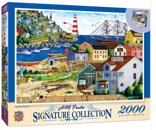 Masterpieces 39 "x 27" 2000pc Signature Series Puzzles présente des cerfs-volants pour les enfants le long de la plage alors que les navires se déplacent vers la mer au loin....