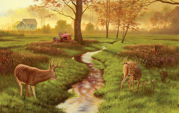 Deux dollars s'affrontent à travers un ruisseau à l'automne. Profitez de ce puzzle de 550 pièces.