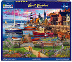 As the sun begins to set in the distance the lighthouse calls the boats home. Slowly, they start gathering in the harbor. A boy is fishing off the dock while his dog keeps a close eye on him. Artist David Maclean presents a peaceful evening at the harbor in this 1000 piece jigsaw puzzle.