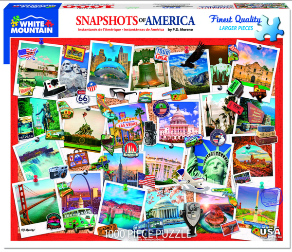 Coincé à la maison cet hiver? Eh bien, faites un voyage en fauteuil à travers ces grands États-Unis à la fois. Votre tournée tranquille vous mènera à travers le pays, de la Statue de la Liberté à l'est jusqu'au Golden Gate Bridge à l'ouest, avec des arrêts en cours de route sur des sites intéressants tels que la Maison Blanche, la Liberty Bell, le Mount Rushmore et Las Vegas. Puzzle de 1 000 pièces avec une taille finie de 24 "x 30". P.D. Moreno