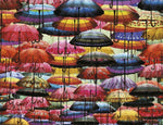 Des rangées de parapluies colorés dans une variété de motifs et de motifs floraux, apparemment suspendus dans les airs.