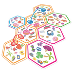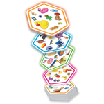 Large hexagon-shaped cards, each with 10 different symbols on them.