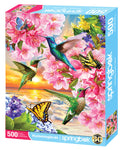 Cette image est une représentation dynamique et colorée de la beauté de la nature, présentant un coucher de soleil serein sur l'océan en toile de fond. Au premier plan, trois colibris avec des plumes irisées planent près des fleurs roses fleuries, extraitant du nectar. Leurs positions dynamiques ajoutent un mouvement de sens à la scène. Deux papillons, un jaune et noir et un autre bleu et noir, sont également représentés près des fleurs, ajoutant à la diversité de la faune. La verdure luxuriante et les fleurs peignent une image du printemps en pleine floraison. Il s'agit d'un puzzle relaxant et serein de 500 pièces parfait pour échapper à l'agitation quotidienne.