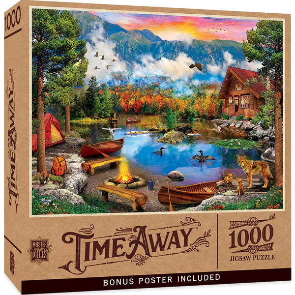 Ces chefs-d'œuvre 19,25 "x 26,75" 1000pc Puzzle en papier artisanal Temps ont un coucher de soleil en soirée au camping à travers le lac. Avec sa boîte en papier artisanale,...
