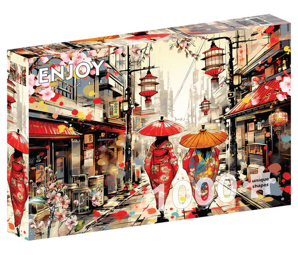 Time for a Tokyo Stroll on a misty day where the sun is doing its best to shine through the fog. Two women with their parasols take in the architecture of Tokyo and all the small shops along the way, while being guided by the hanging lanterns on the lampposts. It also appears to be cherry blossom season, how lucky to be in Japan during this time of year.