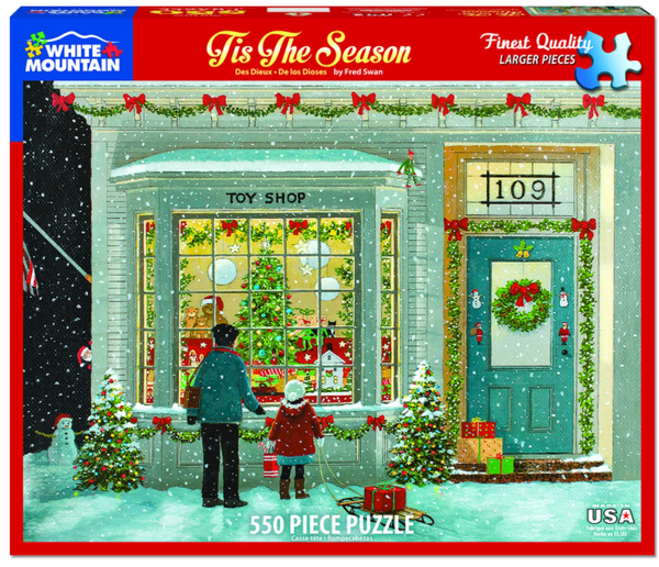 Quel régal d'avoir cette nouvelle image par le très aimé Fred Swan. La mère et la fille sont sur le chemin du retour de la traîneau et se sont arrêtés à la boutique de jouets par excellence pour profiter de la fenêtre. Les fans de Fred savent qu'il baise généralement un chat quelque part dans ses images de la Nouvelle-Angleterre, mais sur ce puzzle de 550 pièces, vous vous amuserez plutôt à la recherche de ces elfes embêtants des étagères! Taille finie 18 "x 24".
