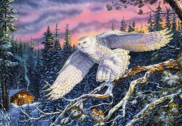 Un hibou enneigé prend son envol dans une forêt alpine alors que le soleil commence à se coucher, sa journée à commencer.