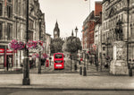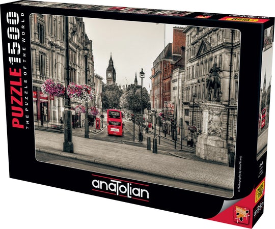 Une photo en noir et blanc d'une rue à Londres, accentuée de quelques éclaboussures de teintes rouges.Comprend un support de boîte pour faciliter la résolution du puzzle.