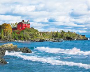 Les vagues s'écrasent. Le plus moelleux des nuages ​​passe. Au sommet d'une falaise rocheuse se trouve une maison rouge vif, une destination pour ceux qui rentrent à la maison à...