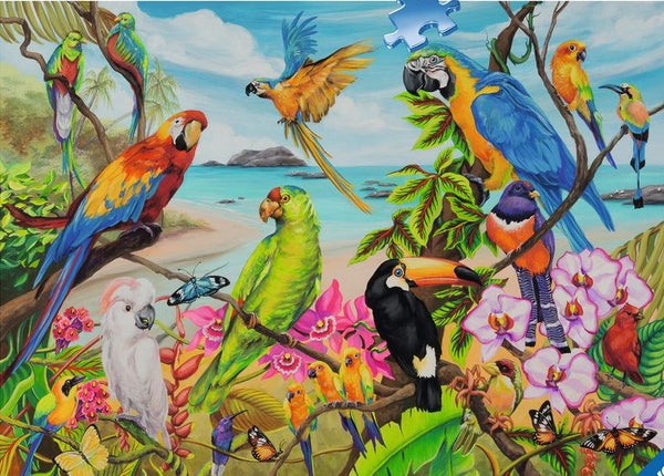 Assemblez les pièces pour révéler les oiseaux colorés de toutes formes et tailles perchées dans des plumeria roses sur les rives d'une plage tropicale pour un luau aviaire.