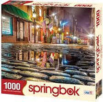 Venez voir la vie nocturne avec le puzzle de la rue Wharf Street de Springbok. Ce puzzle illustré est plein de couleurs vives néon des vitrines contrastées avec les ombres et les reflets du ciel du soir.