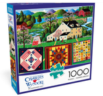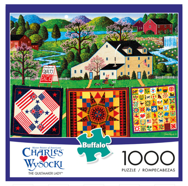 Les courtepointes peuvent être vues dans une grande variété de styles et être créées de plusieurs manières uniques. Les traditions et les modes de vie sont ancrés dans sa courtepointe, car il peut représenter les valeurs et la culture d'un endroit particulier. Grâce à ce puzzle, on ne peut apprécier le temps et l'effort que cette femme a consacrés à ces courtepointes. Maintenant, vous pouvez avoir une courtepointe dans votre maison avec ce puzzle de 1 000 pièces de Charles Wysocki intitulé The Quiltmaker Lady.