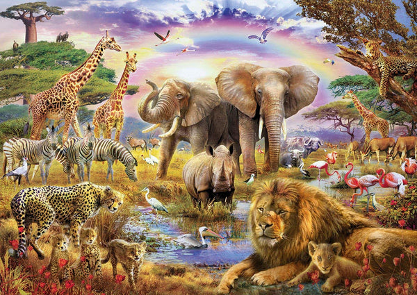 Les animaux de partout de l'autre côté de la savane se rassemblent sous un arc-en-ciel au point d'eau.Comprend un paquet de colle FixPuzzle® et des instructions à utiliser.
