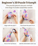 No glue needed! Includes an inner cup to build the curved plastic 3D puzzle "shell" around (the puzzle is divided into 4 different sectioned bags for ease of assembly).