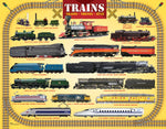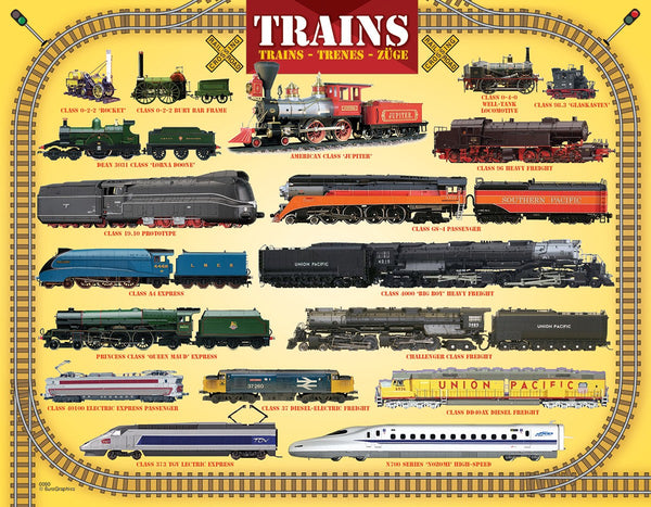 Ce puzzle de train comprend plus de 15 locomotives, allant de la vapeur vintage aux locomotives modernes.