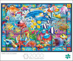 Ce puzzle de 2000 pièces intitulé Aquarium en vitraux comprend une belle fenêtre de verre tachée d'animaux aquatiques! Les dauphins, les poissons-lion, les hippocampes, les tortues, les étoiles de mer,...