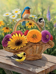 Un bouquet d'été de magnifiques mamans et marguerites admirées par de jolis petits oiseaux. Ce doit être le plus beau panier de fleurs et d'oiseaux dans de belles couleurs d'été!