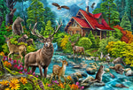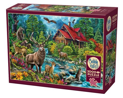 La faune est sortie pour jouer près du ruisseau babillant tandis que quelqu'un à l'intérieur de la cabine rouge se maintient au chaud avec un feu. Ce puzzle de 2000 pièces est de couleur audacieuse et une beauté lorsqu'il est assemblé. Les buissons et les arbres verts luxuriants seront un bon défi avec le blues du ciel et de l'eau et des bruns de la créature. Profitez de l'aventure!