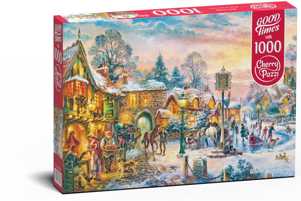 La boîte est endommagée L'ancien carré du marché brille un après-midi d'hiver, invitant tous à se réchauffer dans des endroits confortables. Chaque détail est joli couvert par une couche blanche...