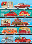 Holiday Hustle est une image rétro Diane Dempsey 1000 dans une orientation de portrait. Les voitures, les camions et les camping-cars vintage se dirigent vers les vacances avec la citation...