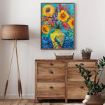 La composition et le style de texture crée l'illusion du mouvement. Il est étonnant que cette peinture ait été faite par le bout des doigts. Peinture florale absolument magnifique, vibrante et contemporaine. Des tournesols jaunes sur un fond tourbillonnant bleu vif - cette peinture est parfaite pour apporter la joie de la nature à l'intérieur pour égayer une pièce ou un bureau.
